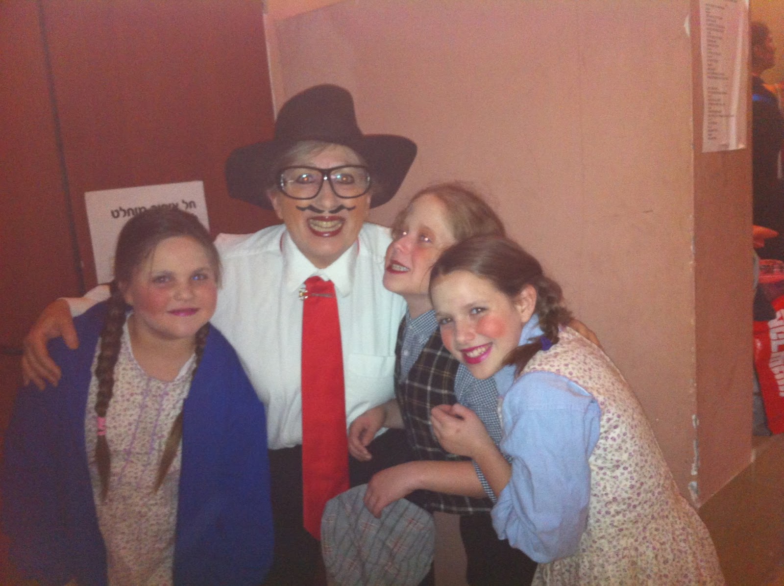 But there were some costumes that made the cut - an orange salamander, a dozen large fish, our NOAH caterpillar bearing Gush Katif's logo, RUTH's Machlon and Chilion costumes.